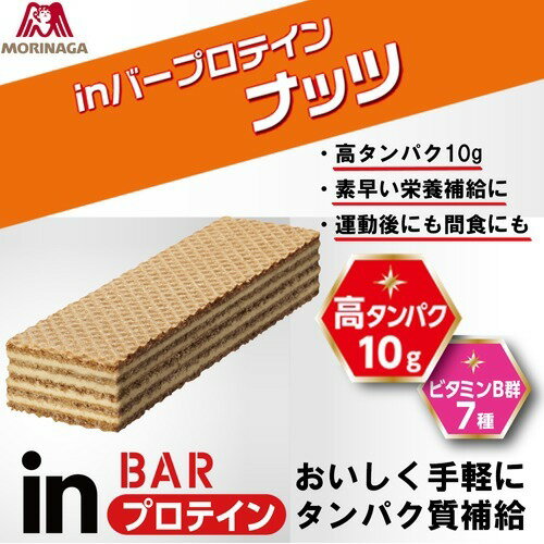 ●プロテイン(たんぱく質)10.0g●たんぱく質の働きに必要なビタミンB群7種配合【品名・名称】栄養調整食品(たんぱく含有小麦焼成食品)【森永製菓 inバー プロテイン ナッツの原材料】小麦粉、砂糖、大豆たんぱく、ショートニング、ホエイたんぱく(乳成分を含む)、植物油脂、ヘーゼルナッツペースト、果糖、ココアパウダー、難消化デキストリン、とうもろこしでん粉、さとうきび抽出物、食塩/乳化剤、香料、膨張剤、ナイアシン、パントテン酸Ca、V.B6、V.B2、V.B1、葉酸、V.B12【栄養成分】1本(37g)あたり熱量:193kcalたんぱく質:10.4g脂質:10.3g炭水化物:15.1g(糖質:14.2g、食物繊維:0.32-1.5g)食塩相当量:0.27gナイアシン:8.0mgパントテン酸:2.7mgビタミンB1:0.29-0.88mgビタミンB2:0.55mgビタミンB6:0.58mgビタミンB12:0.8-2.6μg葉酸:83-252μg【アレルギー物質】小麦、乳、大豆【保存方法】直射日光・高温・多湿を避けて保存してください【注意事項】・卵を含む製品と共通の設備で製造しています。